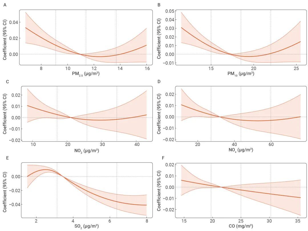 研究发现,空气污染与端粒长度之间的关联呈近似线性,即随着空气污染物暴露水平上升,端粒长度降低(图2)。在考虑了年龄、性别、种族、教育程度、收入等因素后,SO2与端粒长度的关联最为显著。SO2每升高10 μg/m3,端粒长度降低7.30% (95% CI:4.65-9.89);其次为PM2.5和PM10,浓度每升高10 μg/m3,端粒长度分别降低3.07% (95% CI:0.50-5.56)和1.95% (95% CI:0.25-3.61)。进一步将空气污染依据四分位数转换为分类变量后,结果表明,与下四分位数相比,当空气污染水平处于上四分位数时,端粒长度更低。此外,分层分析发现,经济水平较低、受教育程度较低、BMI较高的人群对空气污染更加敏感。