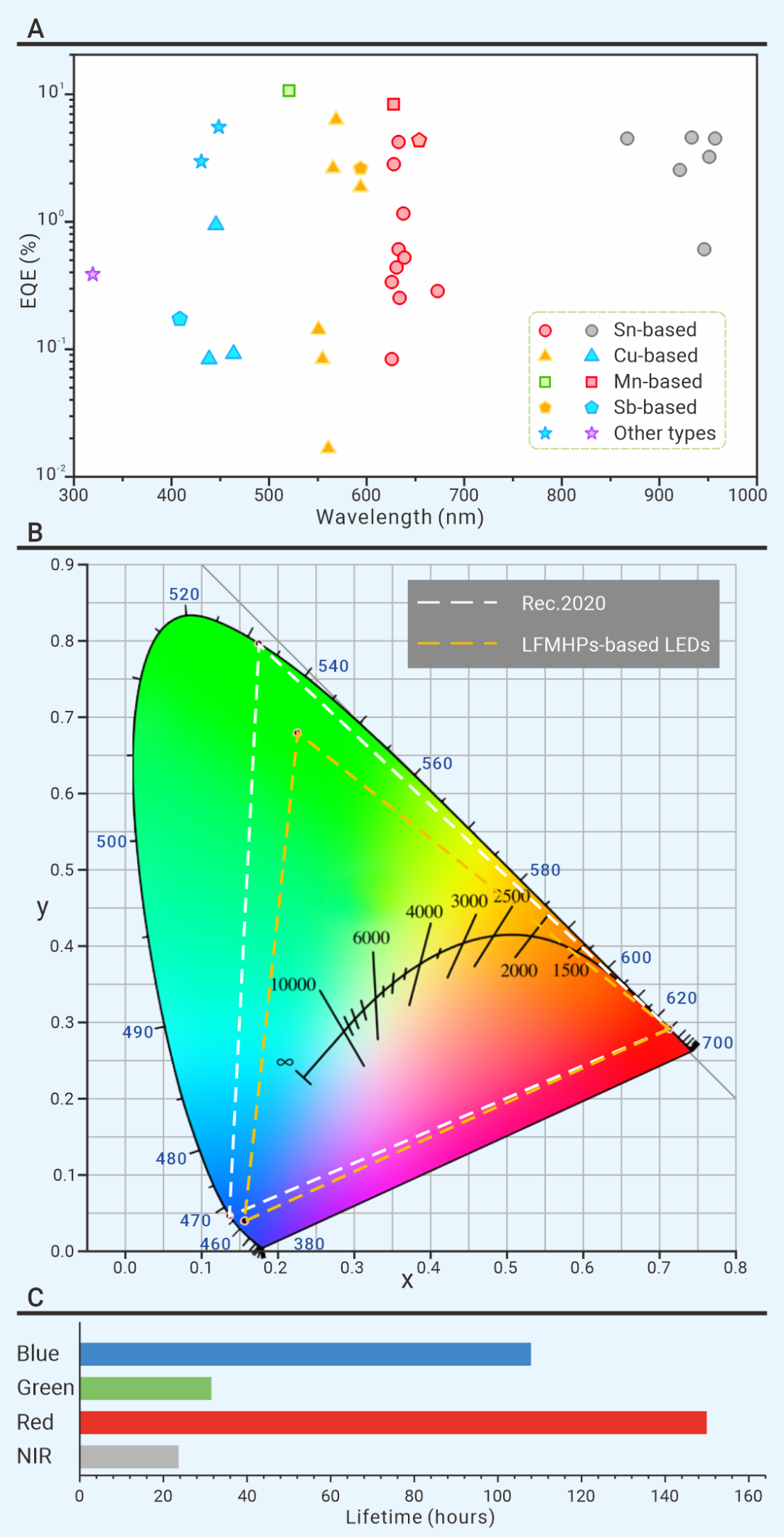 图2非铅PeLED的关键性能参数统计。(A)外量子效率;(B)色域范围;(C)器件运行寿命