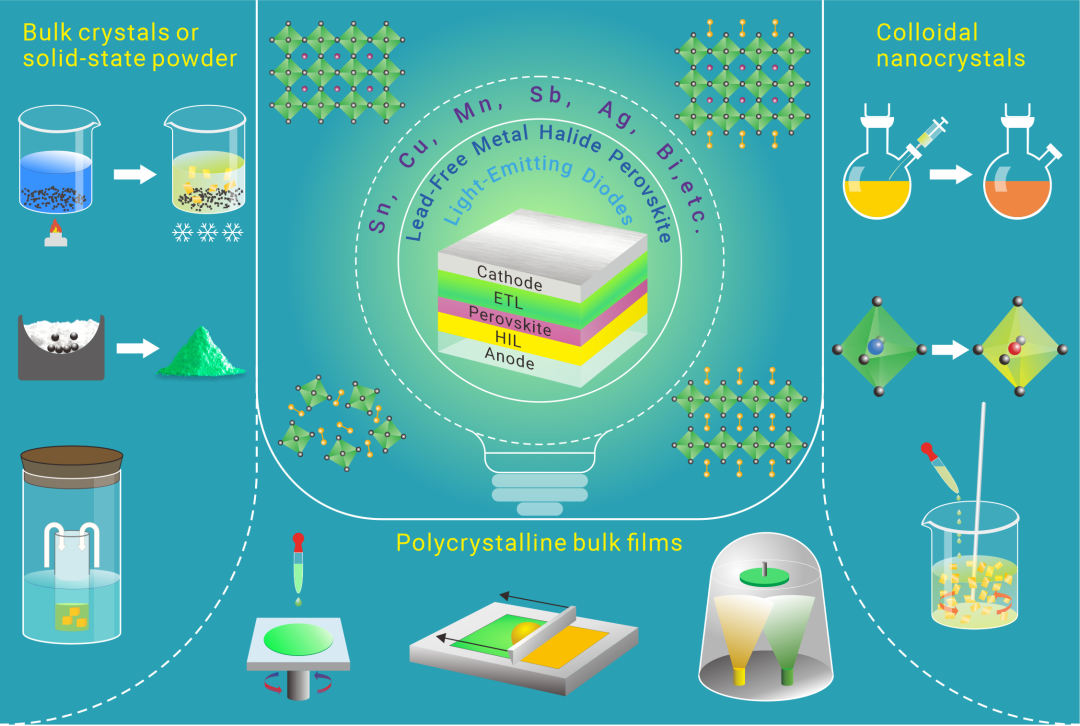 金属卤化物钙钛矿是制造高性能电致发光器件的明星材料。然而,主流的钙钛矿材料依赖于有毒的铅元素,其高毒性和低稳定性等问题将成为未来商业化道路上的“拦路虎”。非铅钙钛矿作为取代铅基钙钛矿的候选材料在钙钛矿发光二极管(PeLED)领域掀起了新的研究热潮。